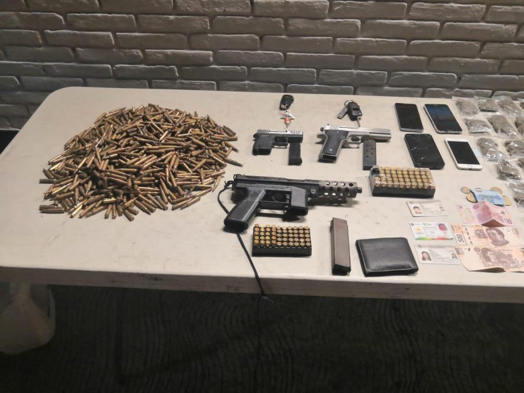 También una garrafa blanca con 900 cartuchos calibre .223, 20 calibre 9 mm, 30 calibre .380 auto, 47 calibre .45 auto y dinero en efectivo; además, un bolso negro con 110 dosis de marihuana y cuatro teléfonos celulares de distintas marcas, por lo que fueron puestos a disposición de las autoridades competentes.