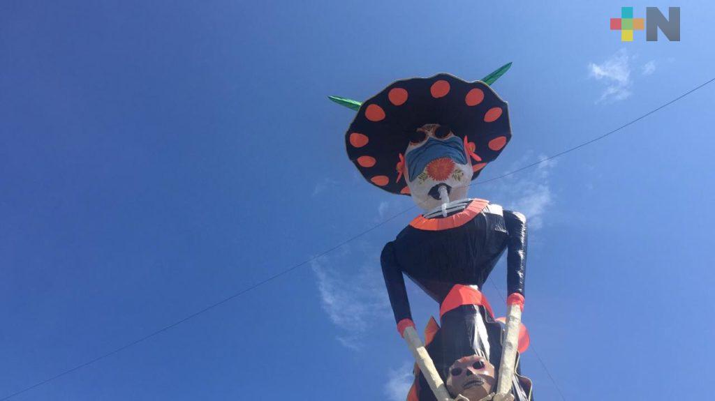 Misantla, Ver.- Con todo y cubrebocas fue instalada la Catrina Gigante toda una tradición en el Parque La Concordia de Misantla, previo a las festividades de Día Todos Santos.