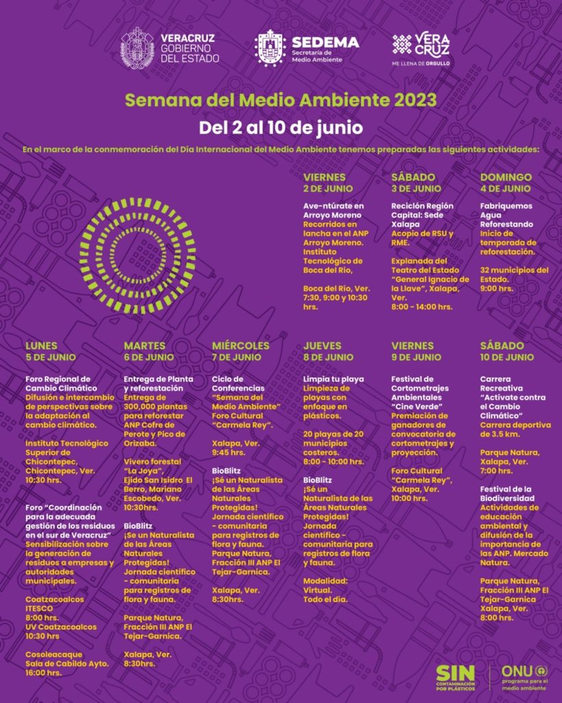 Para mayores informes sobre las sedes y los horarios de las actividades, podrán consultar la liga http://www.veracruz.gob.mx/medioambiente/2023/05/18/semana-del-medio-ambiente-2023/.