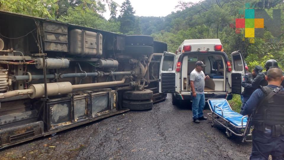 Xalapa, Ver.- Un camión de pasajeros de la empresa Excélsior se volcó cuando circulaba a exceso de velocidad sobré la carretera Teocelo-Ixhuacán.
