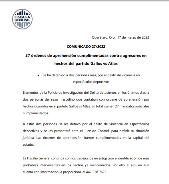Querétaro, Qro.- Elementos de la Policía de Investigación del Delito detuvieron, en los últimos días, a dos personas del sexo masculino que contaban con orden de aprehensión por hechos ocurridos en el partido Gallos vs Atlas. En total, suman 27 mandatos judiciales cumplimentados.