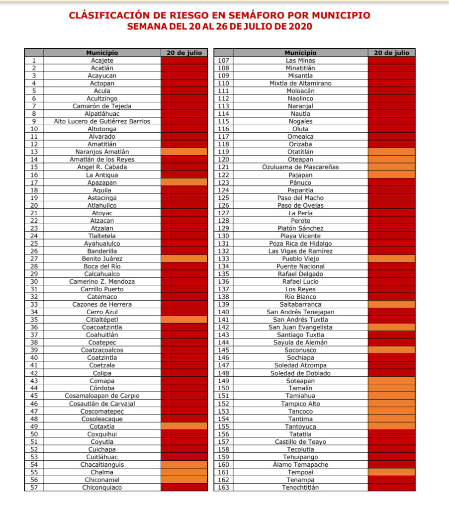 Xalapa, Ver.- Con relación al Semáforo Epidemiológico vigente, a partir del próximo lunes 20 de julio, 32 municipios se suman al nivel de riesgo máximo, por lo que serán 169 en rojo, mientras que 43 municipios estarán en nivel de riesgo alto, es decir, color naranja, informó este viernes la Secretaría de Salud de Veracruz.
