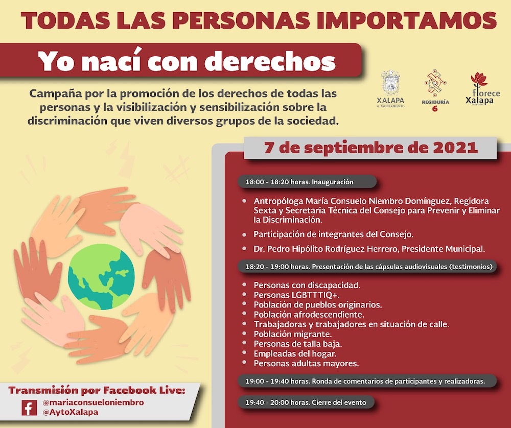 Xalapa, Ver.- Buscando que la sociedad en general modifique conductas con sus semejantes en un claro sentido de respeto a los derechos humanos, el Ayuntamiento de Xalapa y el Consejo para Prevenir y Eliminar la Discriminación en el Municipio de Xalapa (Copreedxa) iniciarán la campaña Todas las Personas Importamos, yo nací con derechos, que consiste en la proyección de videos diversos; es un programa de promoción para impulsar el respeto a las normas universales, explicó la síndica del Ayuntamiento, Aurora Castillo.