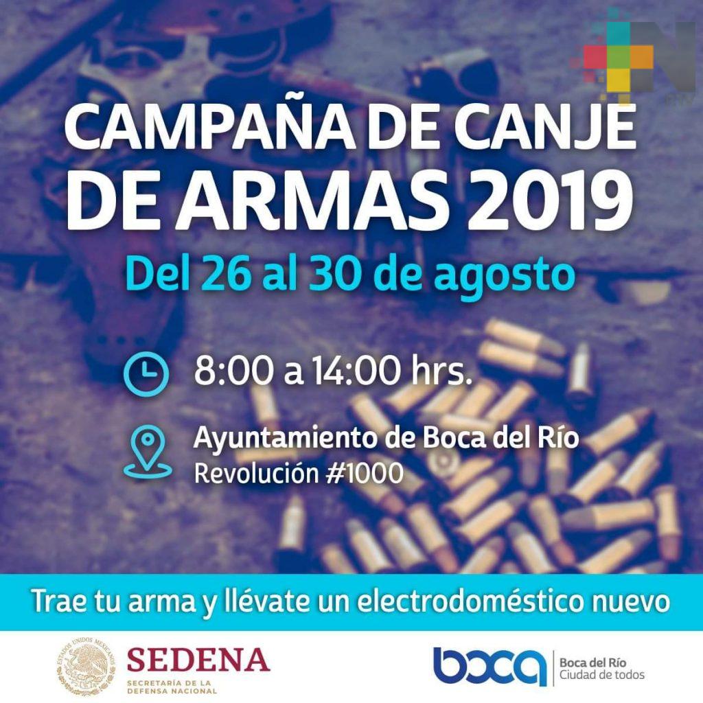Boca del Río, Ver.- Hasta el viernes 30 de agosto estará abierto el canje de armas de fuego en los bajos del palacio municipal de Boca del Río.