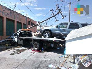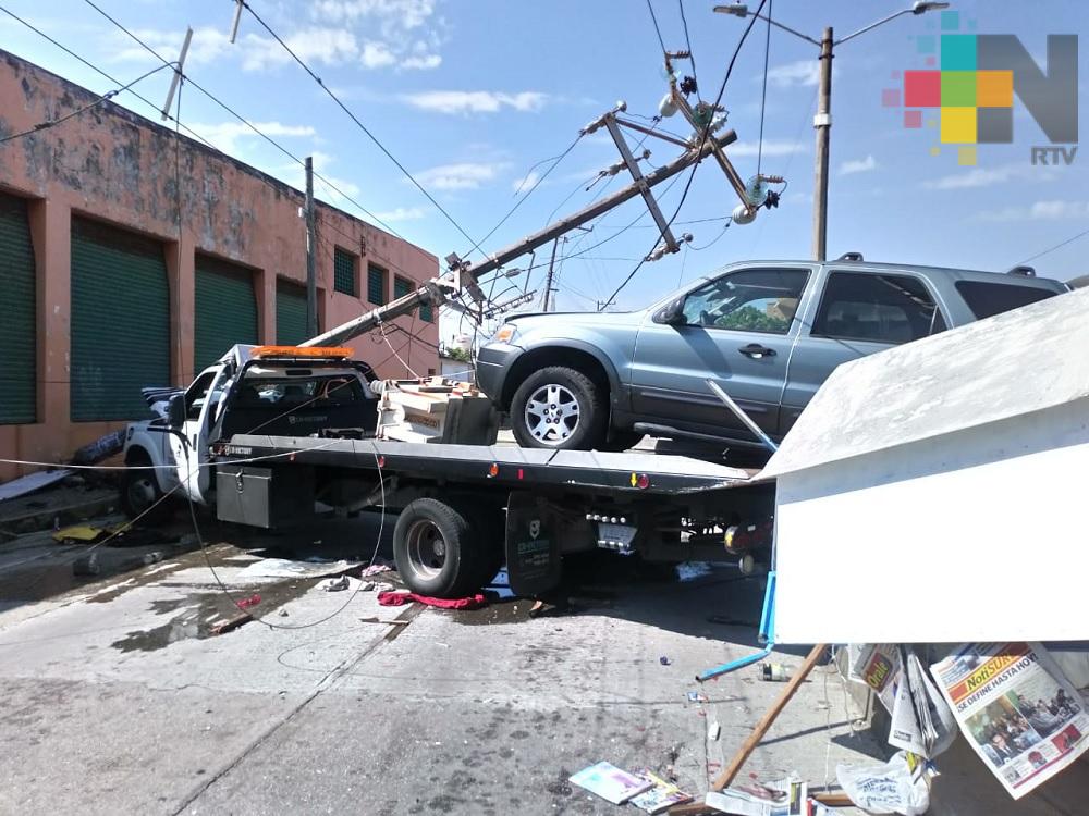 Coatzacoalcos, Ver.- Tras perder el control de la unidad, un chofer de la empresa Grúas Súper Plus se impactó contra un poste de energía eléctrica derribándolo por completo, quedando atrapado en la unidad de transporte de carros.