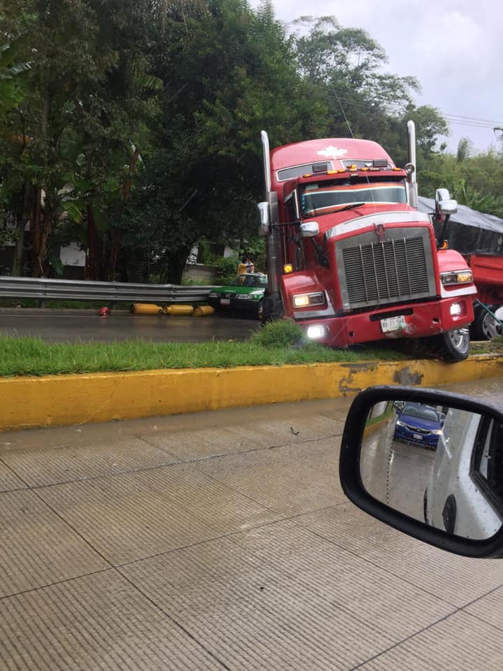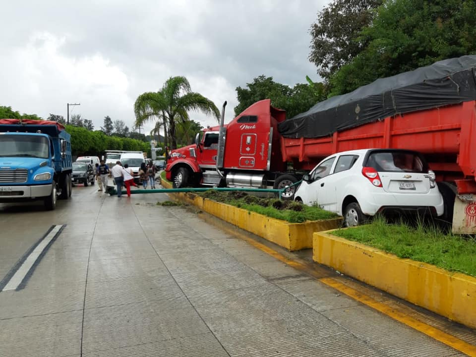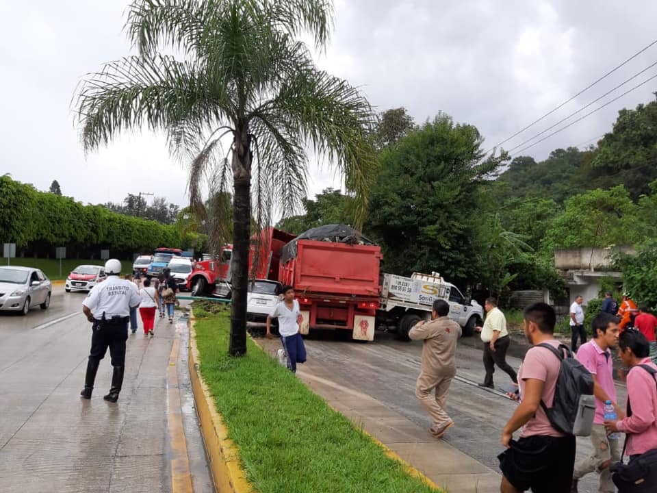 Xalapa, Ver.- Accidente en la autopista Xalapa-Coatepec, en el que se vieron involucrados cuatro vehículos, un trailer, un taxi, una camioneta repartidora de tanques de gas y un vehículo particular.