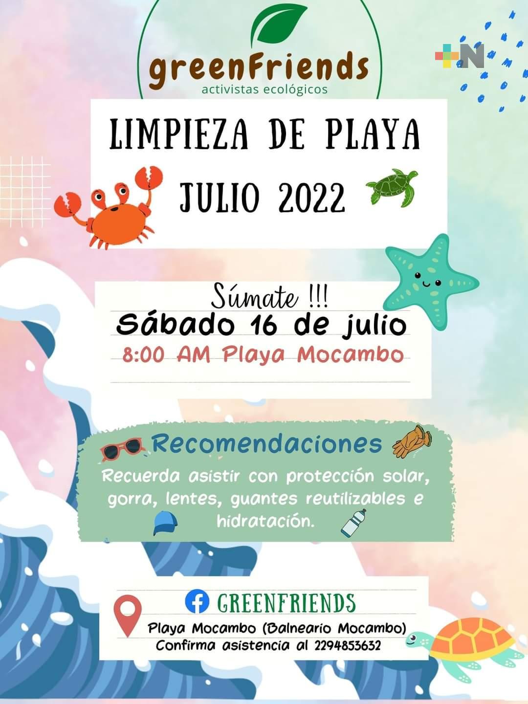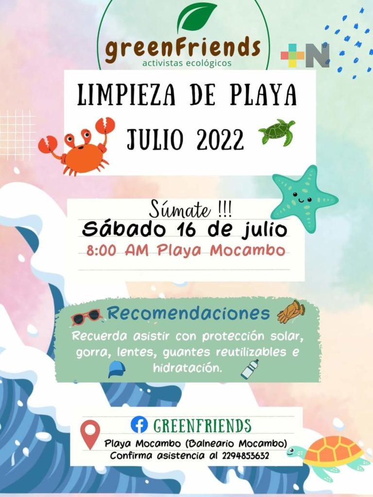 Veracruz, Ver.- Este sábado 16 de julio a las ocho de la mañana convoca la agrupación ambientalista Green Friends a realizar trabajos de limpieza de la playa Mocambo, ubicada en el municipio de Boca del Río.