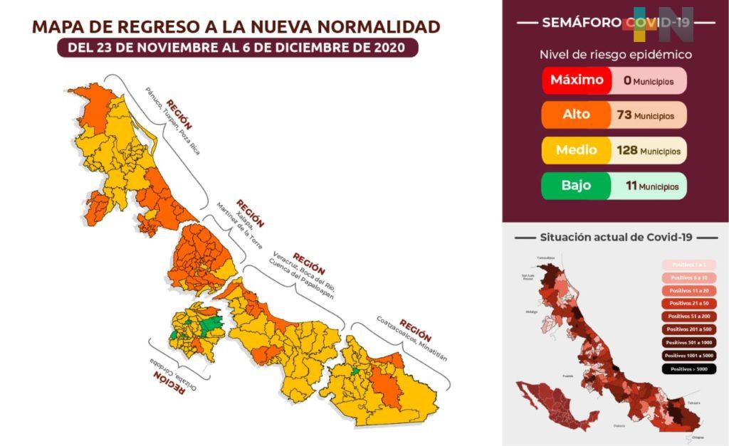 El Comité Técnico del Consejo Estatal de Salud informó que 73 municipios presentan riesgo alto –naranja, 128 municipios riesgo medio -amarillo y 11 municipios riesgo bajo o verde del 23 de noviembre al 06 de diciembre del 2020.