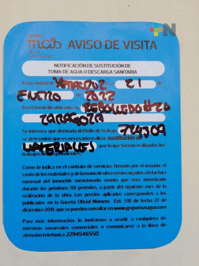 Denunciaron que Grupo MAS les está dejando avisos donde confirman que a la gente la harán pagar todo lo que conlleva la instalación de las tomas a la red hidráulica, incluyendo los materiales, además de la misma mano de obra. El monto será amortizado durante 8 periodos luego de las labores.