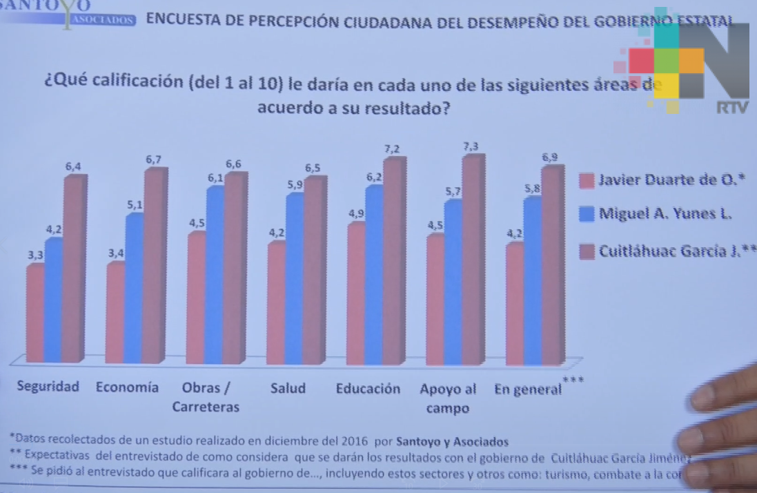 Luis Santoyo Domínguez, director del grupo consultor “Santoyo y Asociados”, relató que el mandatario estatal, Cuitláhuac García Jiménez, resultó con el mejor posicionamiento respecto a los gobernadores que le antecedieron.