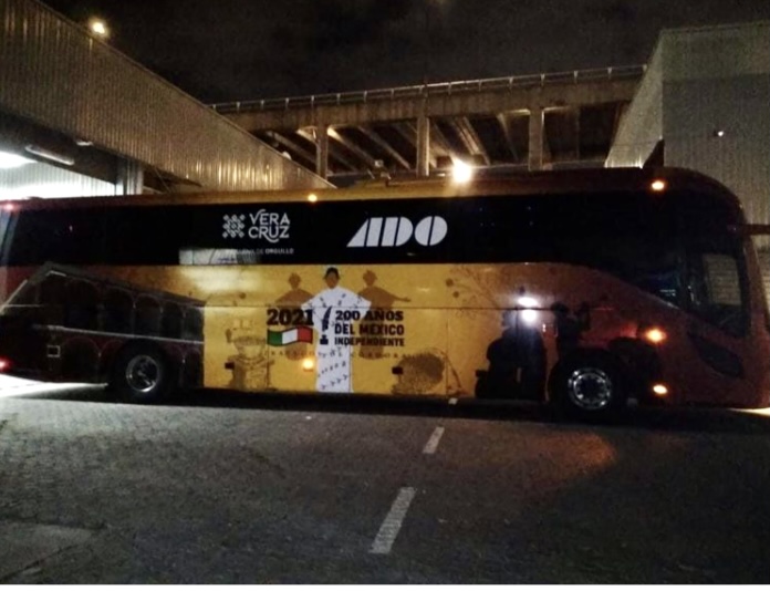 Los autobuses muestran la frase “200 años del México independiente, Tratados de Córdoba” acompañadas de ilustraciones alusivas al tema.