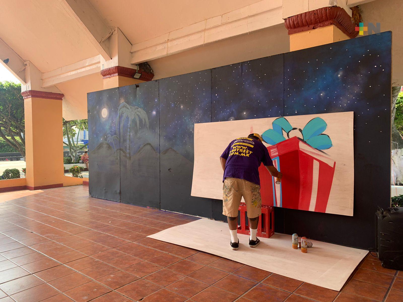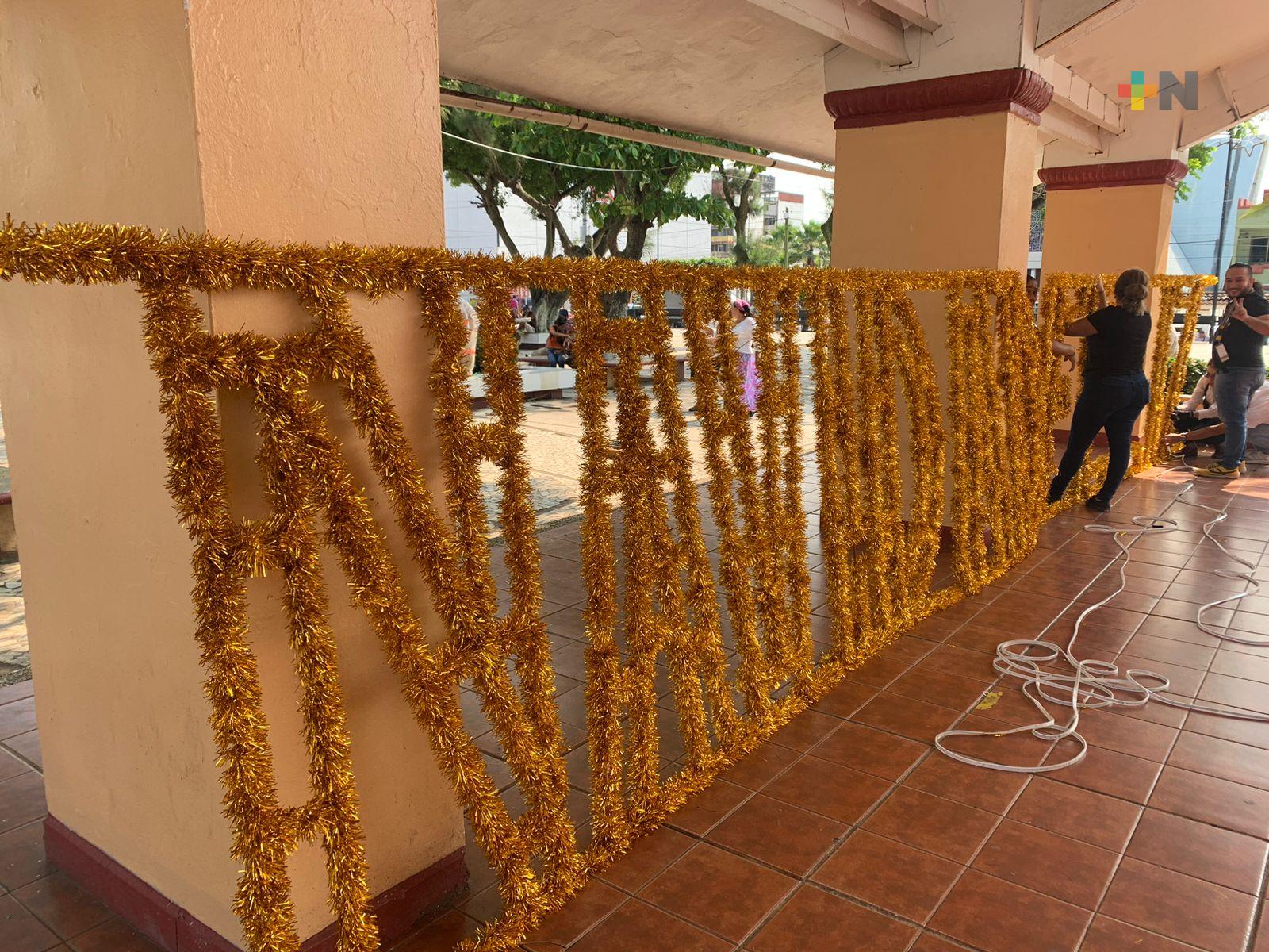 Coatzacoalcos, Ver.- Personal del área de cultura del Ayuntamiento de Coatzacoalcos comenzó a adornar el parque Independencia con motivos navideños.