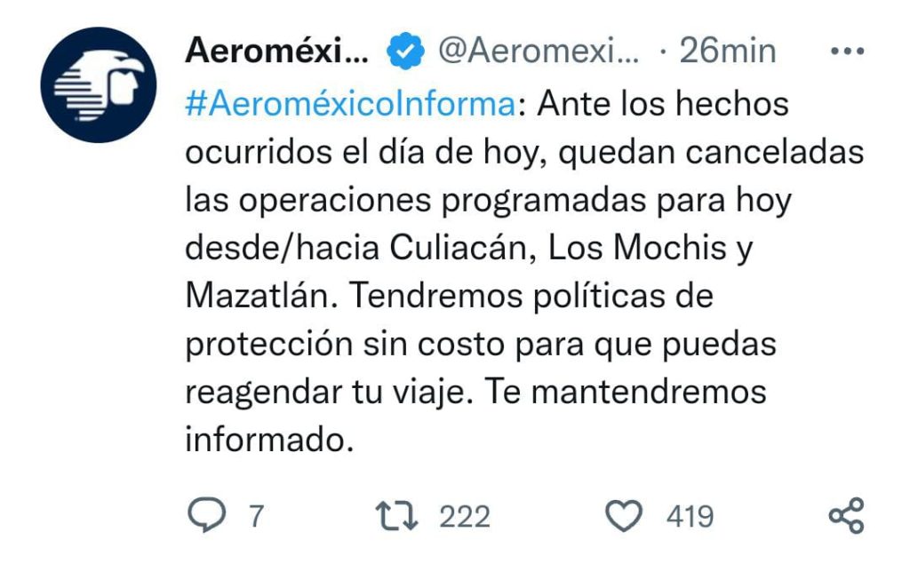 «#AeroméxicoInforma: Ante los hechos ocurridos el día de hoy, quedan canceladas las operaciones programadas para hoy desde/hacia Culiacán, Los Mochis y Mazatlán. Tendremos políticas de protección sin costo para que puedas reagendar tu viaje. Te mantendremos informado», así publicó la aerolínea en Twitter.