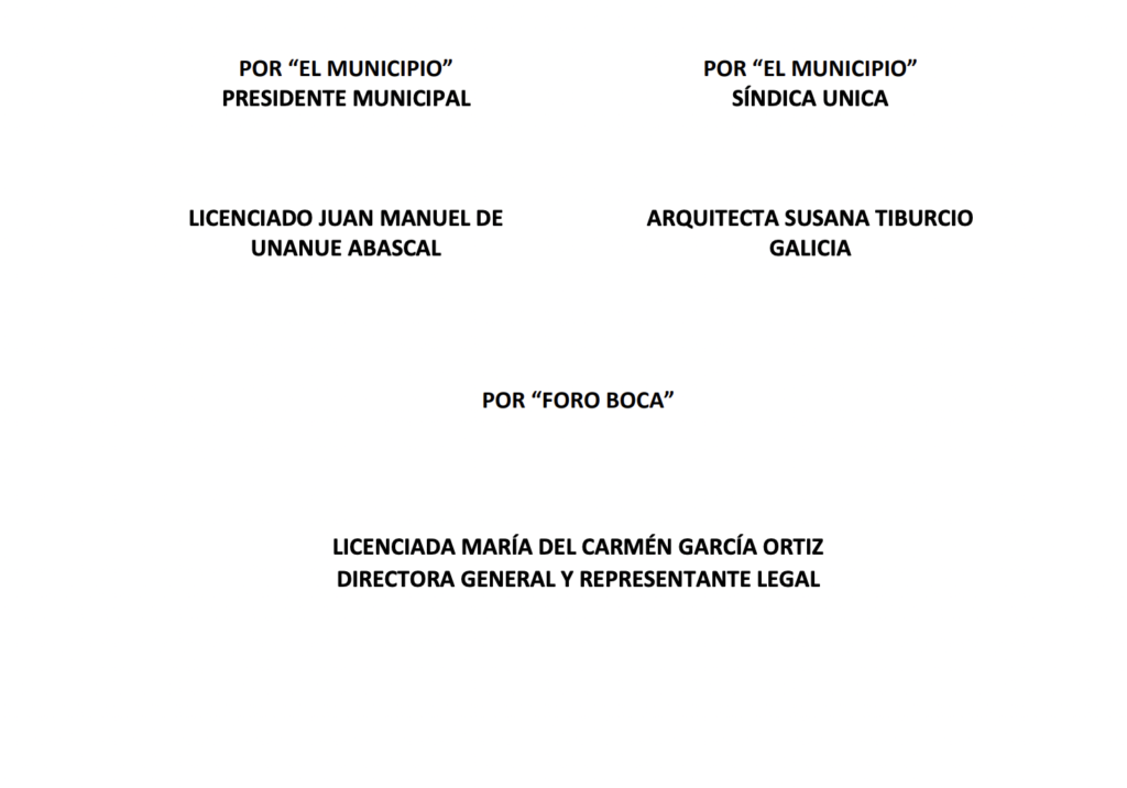 Al calce del convenio contraído entre el Ayuntamiento y el Foro Boca, signaron el compromiso; el munícipe Unanue Abascal, la Síndica Única, Susana Tiburcio Galicia y por parte del recinto, la directora general y representante legal de Foro Boca, María del Carmen García Ortiz.