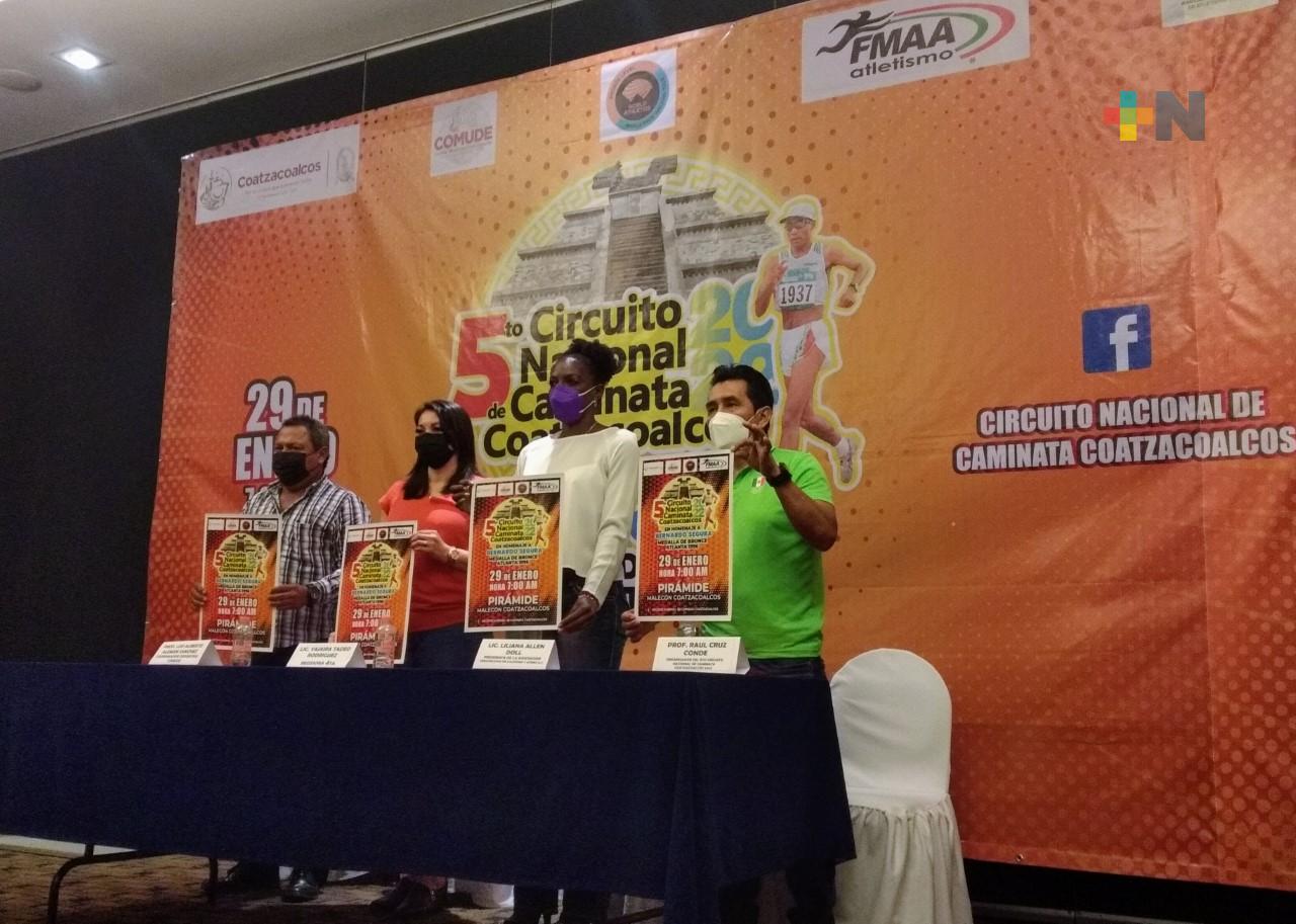 Coatzacoalcos, Ver.- Ante distintos medios fue presentado de manera oficial, la quinta edición del Circuito Nacional de Caminata Coatzacoalcos, evento avalado por la Federación Mexicana de Asociaciones de Atletismo (FMAA) a realizarse el 29 de Enero en el malecón costero de Coatzacoalcos, en conferencia de prensa celebrada en conocido hotel de la ciudad, se dieron a conocer los pormenores de la edición, la cuál ya cuenta con el registro de al menos 120 andarines, entre ellos Alegna González, Ilse Guerrero, Ever Palma, César Córdoba, Alejandra Ortega y el veracruzano Leyver Ojeda, atletas que verán actividad en pruebas como los 20 y 35 kilómetros, informó su organizador, Raúl Cruz Conde.