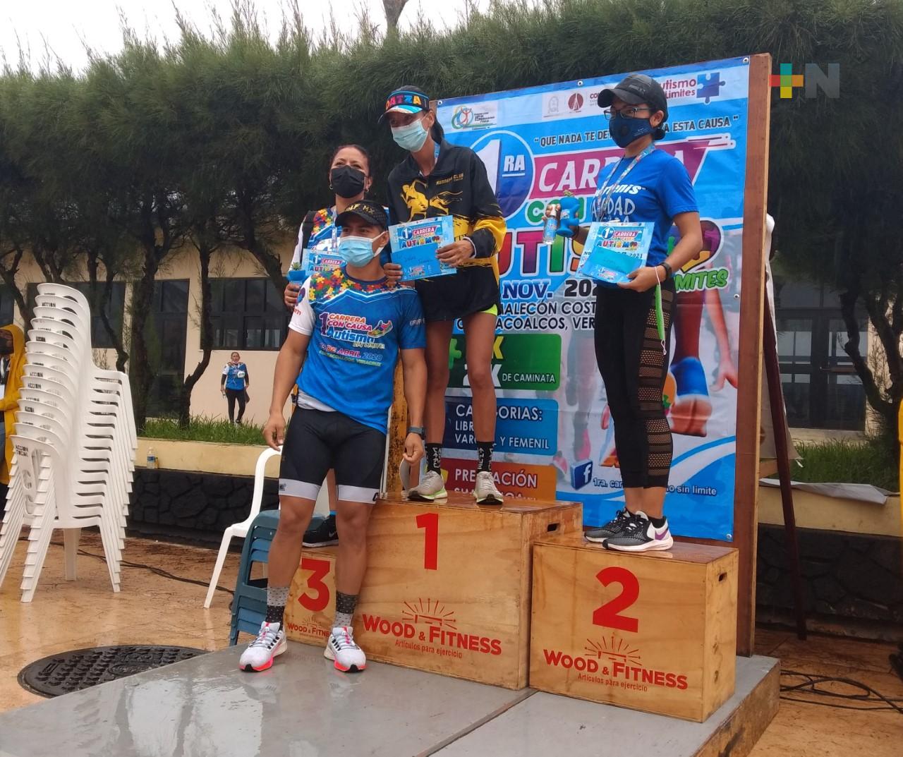 Coatzacoalcos, Ver.- Más de 150 personas, participaron en la carrera con causa «Autismo Sin Límites» efectuada en el malecón costero de Coatzacoalcos, competencia de 5 kilómetros para la categoría libre femenil y varonil dónde se dieron cita corredores de Veracruz, Tabasco y Colombia, convirtiéndose la local Alina Gutiérrez, en la ganadora por las mujeres, llegando a la meta con tiempo de 16:33 minutos, el segundo sitio fue para Claudia Magallanes, mientras que Martha Morales se instaló en la tercera plaza.