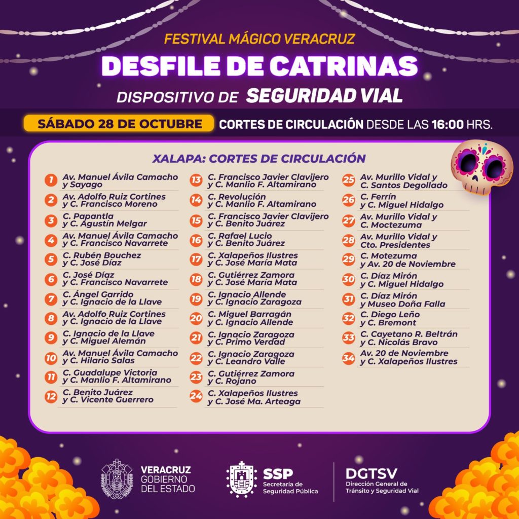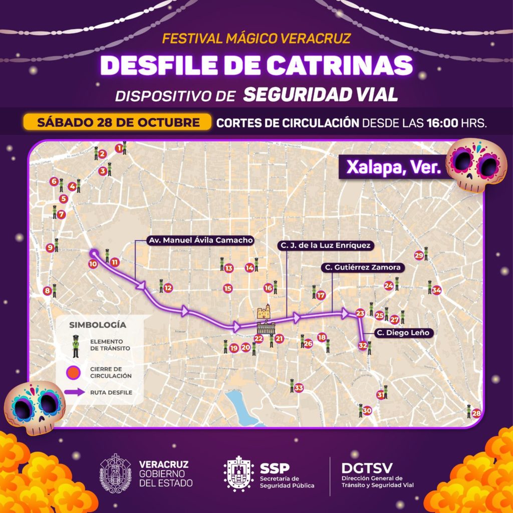 Xalapa, Ver.- La Dirección General de Tránsito y Seguridad Vial prepara un despliegue de elementos en distintos panteones y eventos por la festividad de Día de Muertos; tan sólo en la capital, están previstos 34 cortes de circulación el próximo sábado 28, con motivo del gran Desfile de Catrinas a partir de las 16:00 horas.