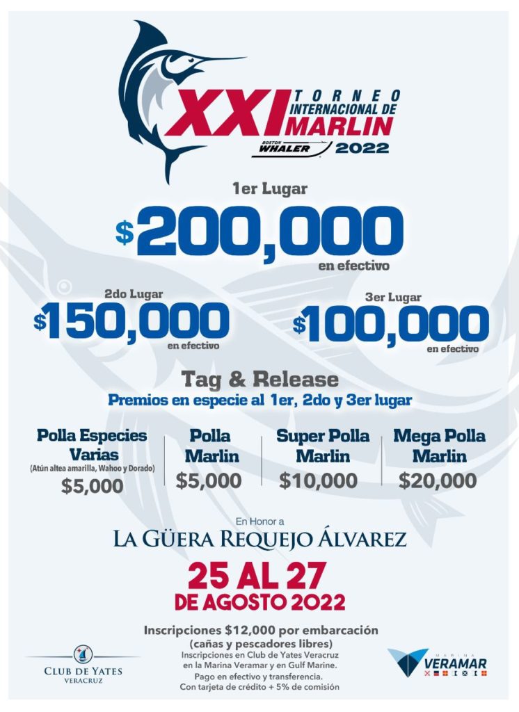 Para mayores informes sobre la edición #21 del Torneo Internacional del Marlín “Boston Whaler 2022”, el Club de Yates Veracruz invita a los participantes a solicitar informes en Marina Veramar.