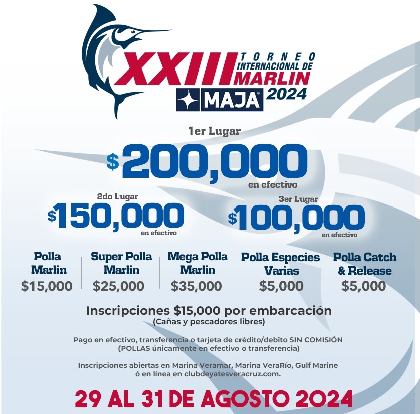 Para mayores informes sobre la edición #23 del Torneo Internacional del Marlín “MAJA 2024”, el Club de Yates Veracruz invita a la ciudadanía y a los participantes a seguir de cerca las redes sociales oficiales.