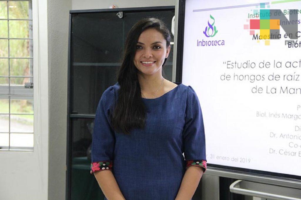 La joven presentó el “Estudio de la actividad antiproliferativa de hongos de raíz obtenidos del manglar La Mancha, Veracruz” el 31 de enero en el Inbioteca, en el que fue asesorada por Antonio Andrade Torres, investigador de esta entidad académica, y que le sirvió para obtener el grado de maestría.