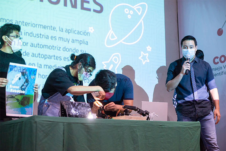 El foro científico inició con la exposición de un brazo robótico por parte de sus creadores, quienes mostraron los movimientos precisos de este artefacto.