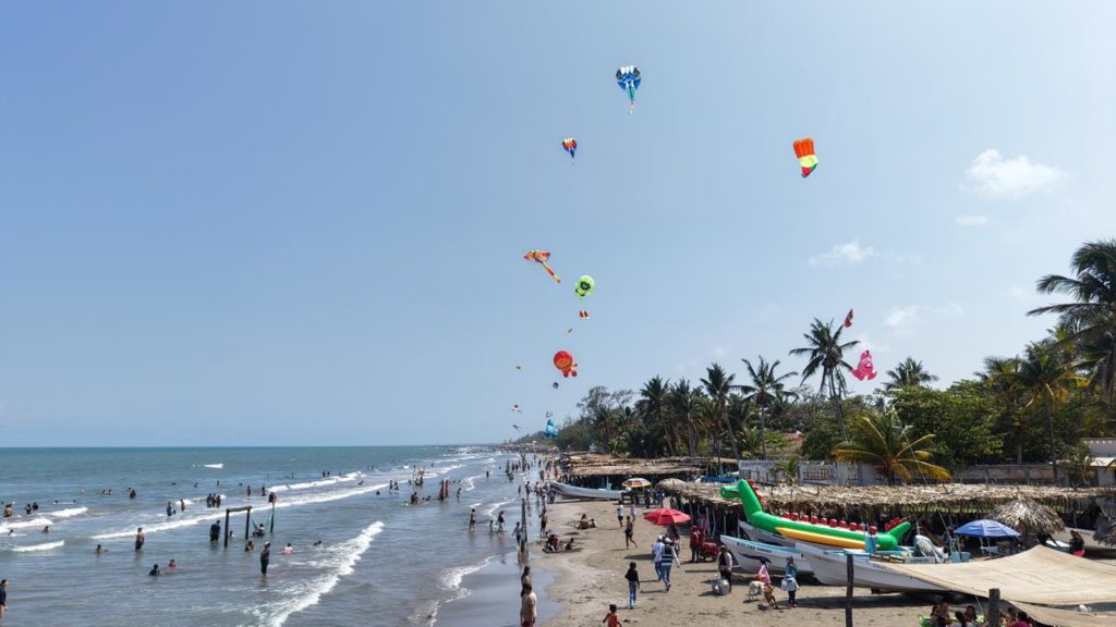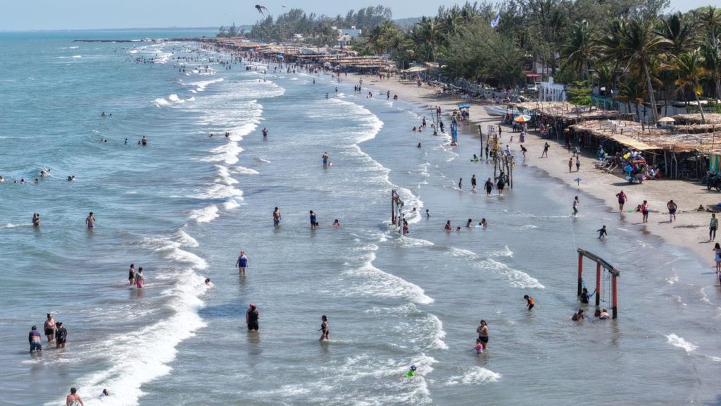 Desde las primeras horas del día se observa la llegada de grupos familiares, que comparten alimentos, practican actividades recreativas como voleibol y disfrutan del mar en un ambiente ordenado y seguro.