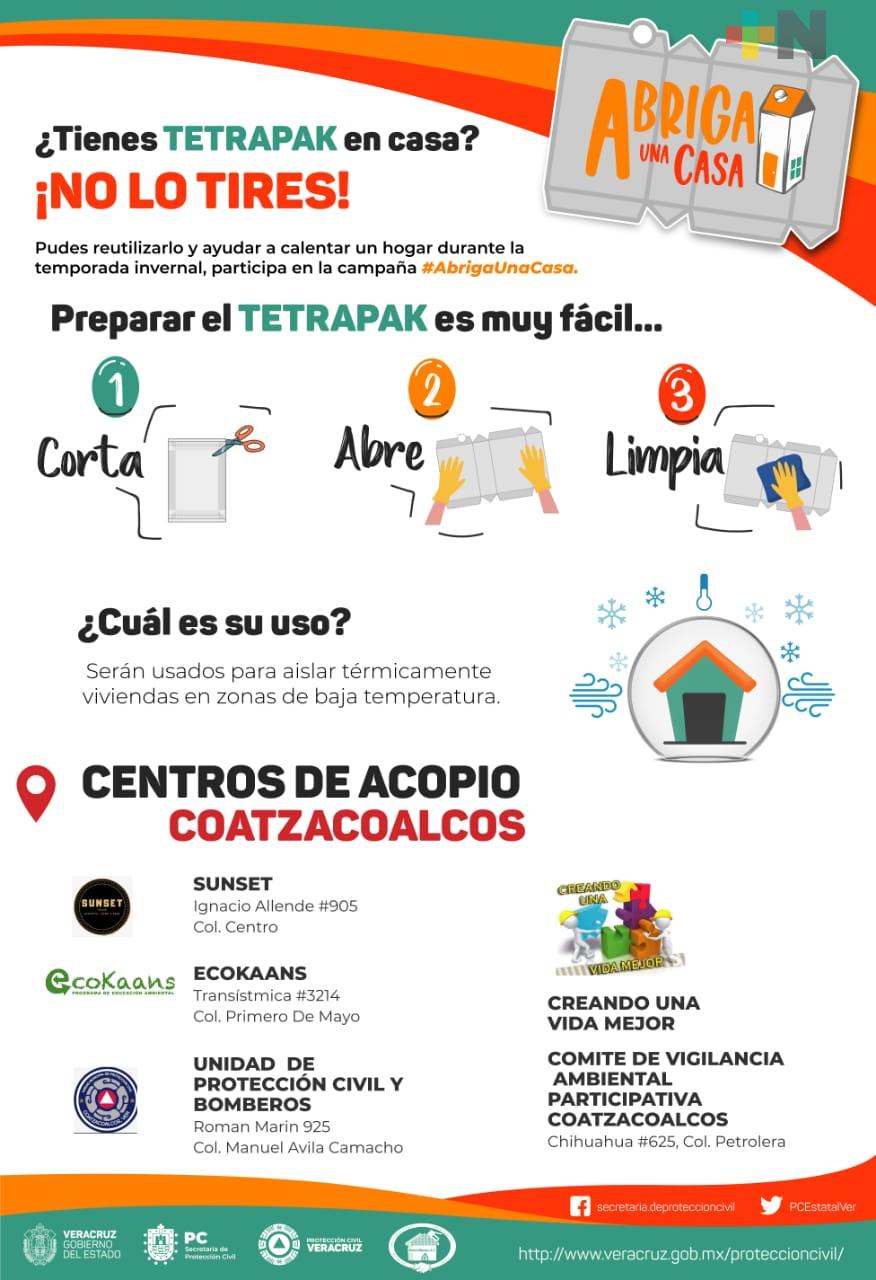 Coatzacoalcos, Ver.- Ambientalistas de Coatzacoalcos se suman a la iniciativa de Protección Civil estatal para recaudar envases de Tetra Pak, que serán utilizados en el recubrimiento de viviendas asentadas en zonas frías.