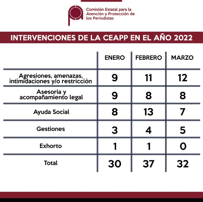 - *Entre enero y marzo se registraron 99 intervenciones en 42 municipios, un 13% más que en 2021. *Persiste dinámica de prevención: en el periodo 19 periodistas fueron incorporados al Programa Preventivo y de Seguridad.