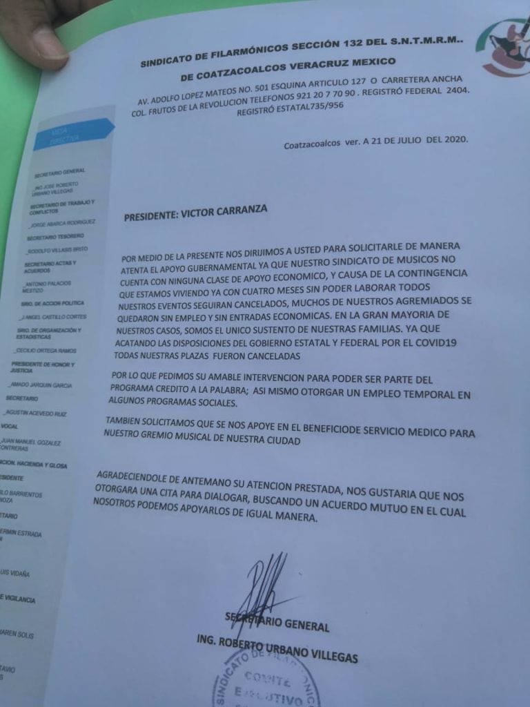 Coatzacoalcos, Ver.- Integrantes del Sindicato de Filarmónicos sección 132 de Coatzacoalcos, hicieron un pliego petitorio a autoridades municipales para que sean considerados con apoyo médico o en algún programa de créditos.