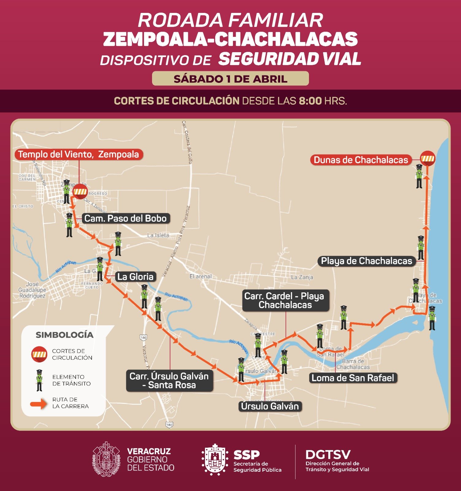 Xalapa, Ver.- Atendiendo las indicaciones del gobernador Cuitláhuac García Jiménez y como parte de la Rodada Familiar Zempoala-Chachalacas, la Secretaría de Seguridad Pública a través de la Dirección General de Tránsito del Estado llevará a cabo cortes de circulación este sábado 1 de abril sobre la carretera estatal en el tramo Zempoala-Chachalacas en horario de 08:00 horas, hasta su finalización.