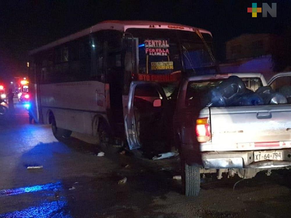 Coatzacoalcos, Ver.- Un aparatoso accidente entre un urbano y una camioneta de venta de agua embotellada se registró la noche de este domingo en la colonia Independencia de Coatzacoalcos, dejando como saldo más de una decena de personas lesionadas, una de ellas de gravedad.