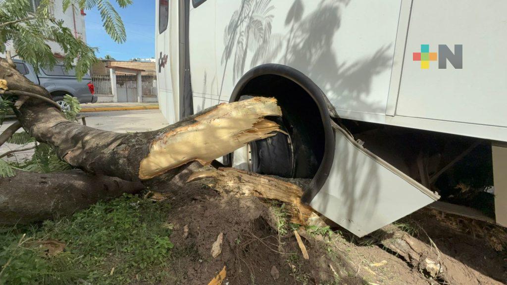 De acuerdo con los datos recabados, el chofer de la unidad identificado como José Fernando, perdió el control cuando se le reventó la llanta por una alcantarilla mal colocada en la calle Malpica en el carril de oriente a poniente, al circular a exceso de velocidad no pudo maniobrar el vehículo International de Transportes Chacalapa Mobility Deluxe con número económico 214, impactándose con un árbol de almendro el cual derribó.