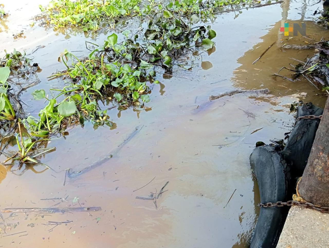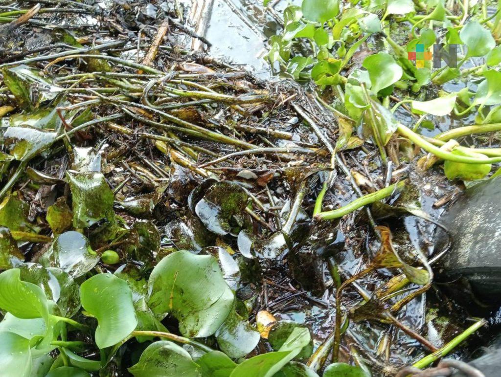 Aparece más lirio acuático cubierto de aceite en muelles de Coatzacoalcos