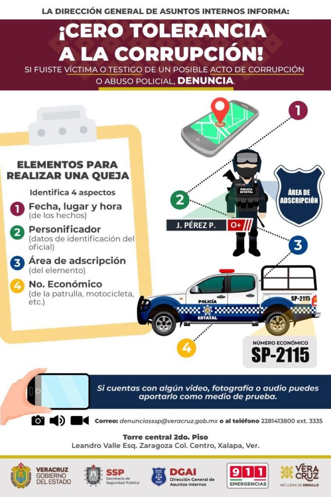 Xalapa, Ver.- La Secretaría de Seguridad Pública (SSP), a través de la Dirección General de Asuntos Internos mantiene la encomienda Cero Tolerancia a la Corrupción, a través de supervisiones permanentes en el actuar de los elementos que integran esta dependencia, por tal motivo iniciaron una investigación administrativa a un elemento de Policía Vial, quien presuntamente habría extorsionado a personas de la tercera edad en esta ciudad.