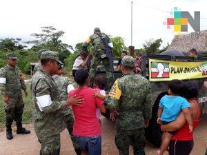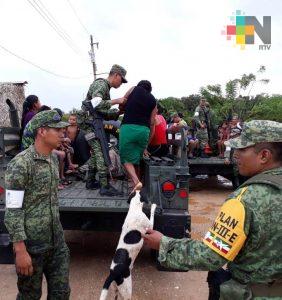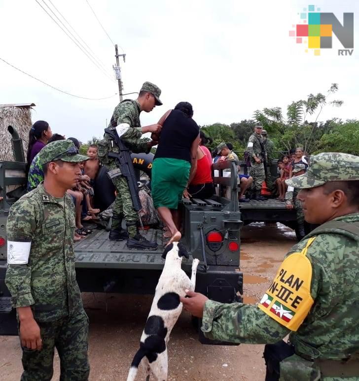 El personal castrense coadyuva de manera ininterrumpida, empleando vehículos militares en la evacuación de personas a los albergues y refugios temporales que han sido activados por parte de las autoridades locales.