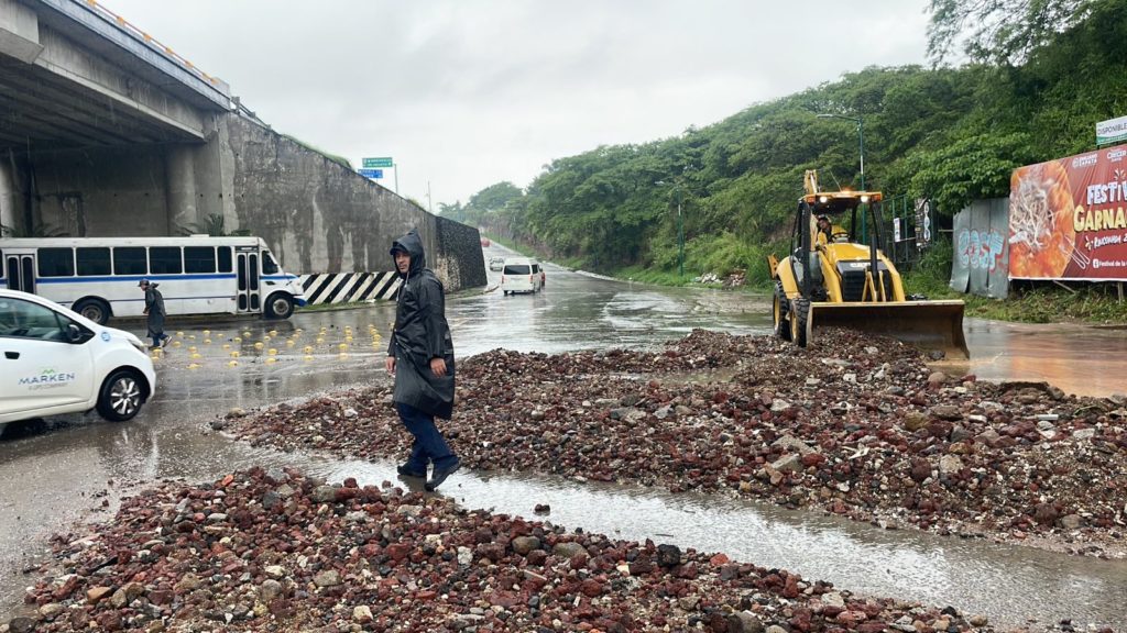 Los trabajos continuaron este sábado con el retiro de piedras, arena y lodo lo que arrastró el agua tras las lluvias de este viernes para dar seguridad al tránsito de vehículos en la zona.