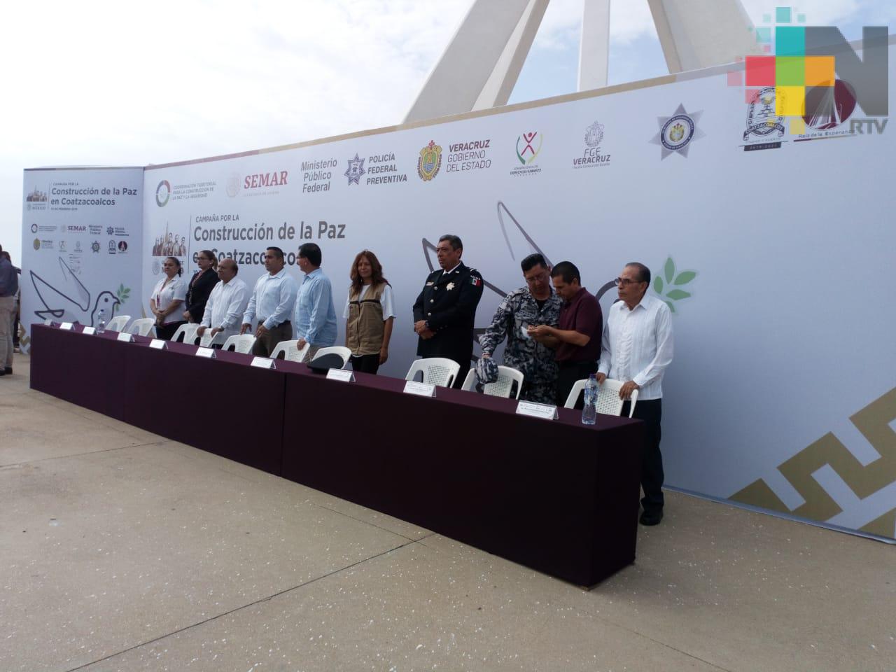 Coatzacoalcos, Ver.- Con la participación de representantes de las fuerzas del orden como Secretaría de la Marina, Policía Federal, Policía Estatal y municipal, arrancó la campaña para la Construcción de la Paz en Coatzacoalcos. una iniciativa que busca trabajar en la prevención del delito desde fondo, es decir con programas que involucren a jóvenes, jefes de manzana y sociedad en general.