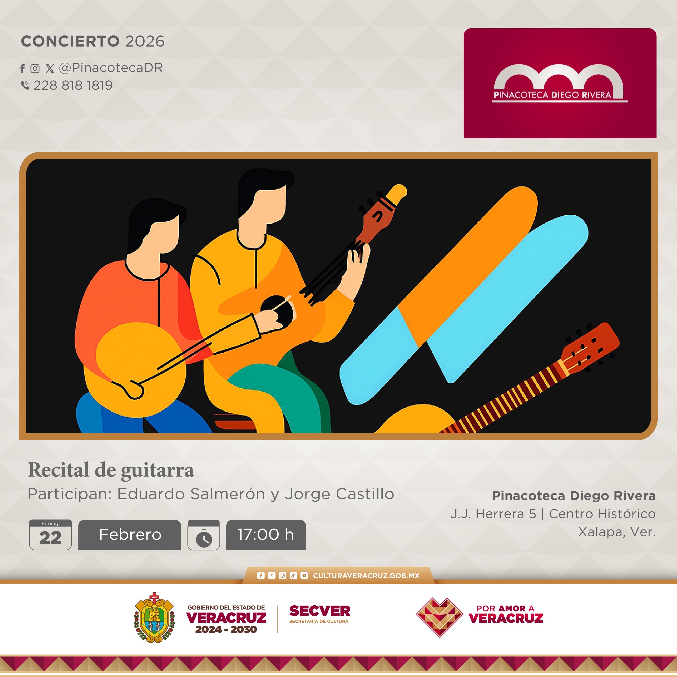 El domingo 22 de febrero, a las 17:00 horas, se llevará a cabo un recital de guitarra clásica a cargo de los músicos Eduardo Salmerón y Jorge Castillo, quienes ofrecerán un programa musical apto para todo público.