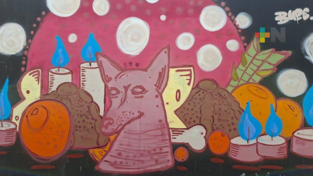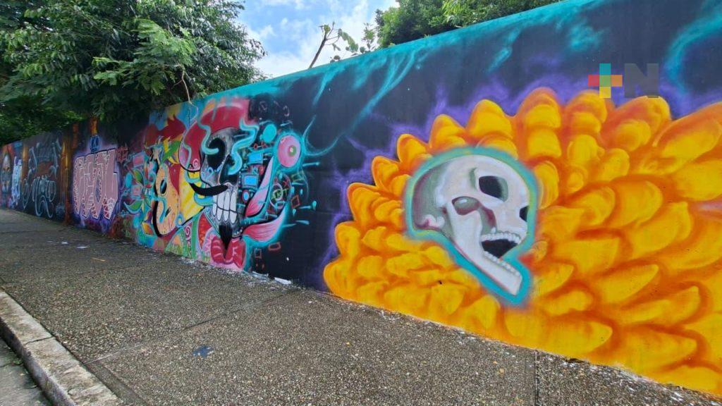 Coatzacoalcos, Ver.- La barda del panteón antiguo municipal de Coatzacoalcos es el lienzo donde artistas urbanos han plasmado sus murales, con la temática de las pasadas celebraciones de día de muertos.