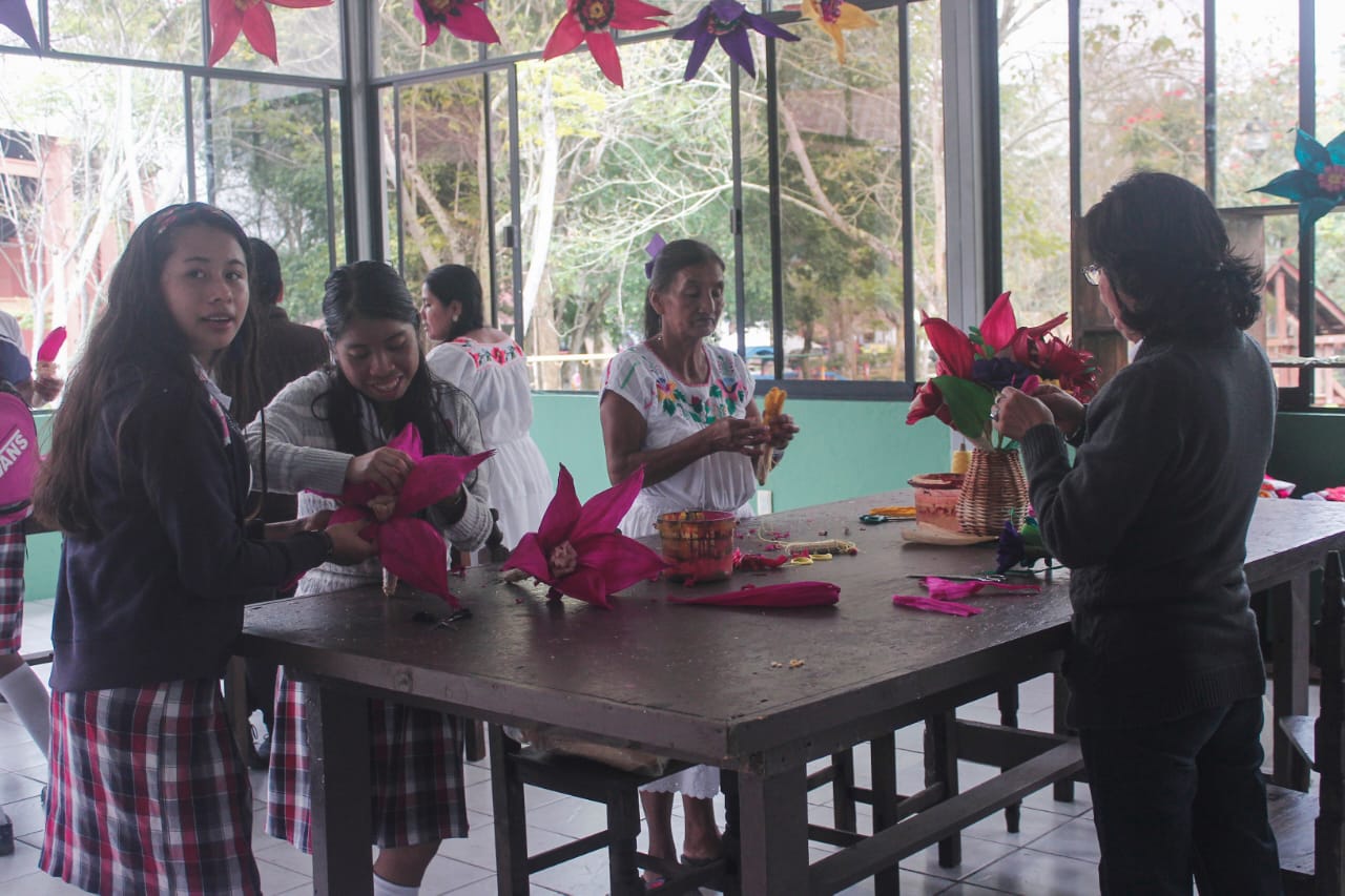 Papantla, Ver.- En el Área de Talleres del Parque Takilhsukut, los asistentes aprendieron a elaborar flores de totomoxtle guiados por artesanos Totonacas.