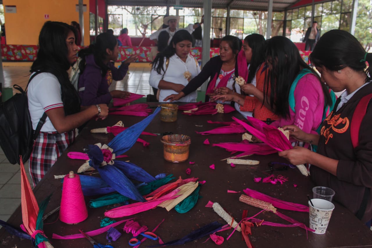 «Yo aprendí a hacer estas flores desde que tenía 20 años. En este taller necesitamos olotes, tijeras, hilo y hojas de totomoxtle. Ella es mi hija Paz, tiene nueve años y también está aprendiendo. Yo pienso que es importante seguir enseñando esto. Hay gente que no quiere compartir lo que sabe. Pero hay que compartir lo que sabemos con la gente, dejarle a los demás la sabiduría. Nos gusta que la gente se vaya contenta y que se lleve su flor que ella misma hace».