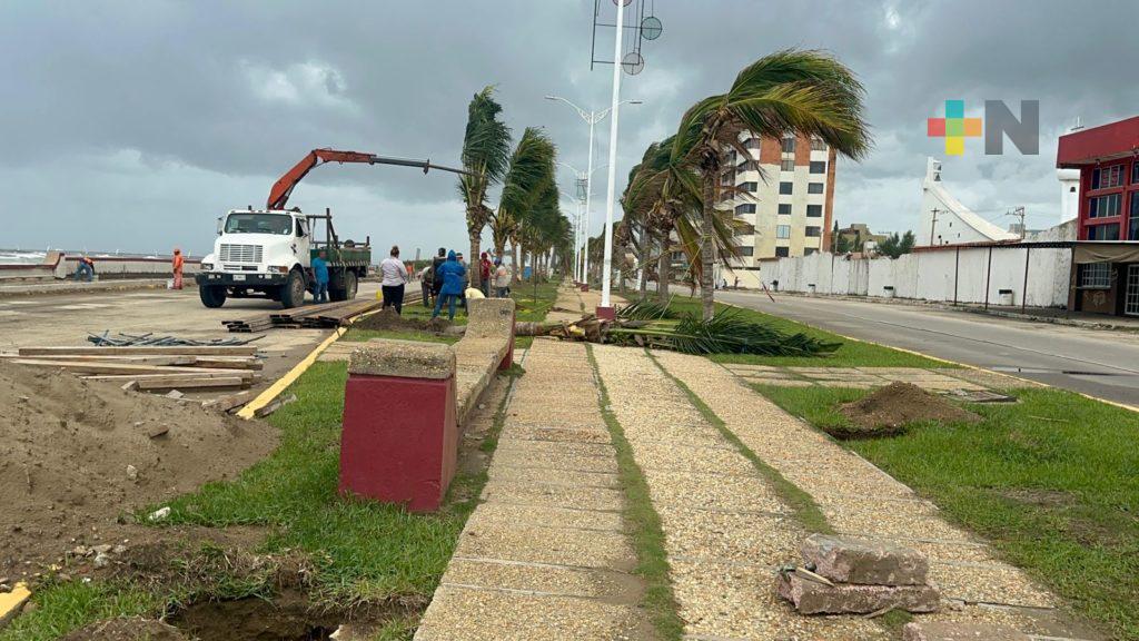 Aseguran palmeras de malecón de Coatzacoalcos por fuertes vientos