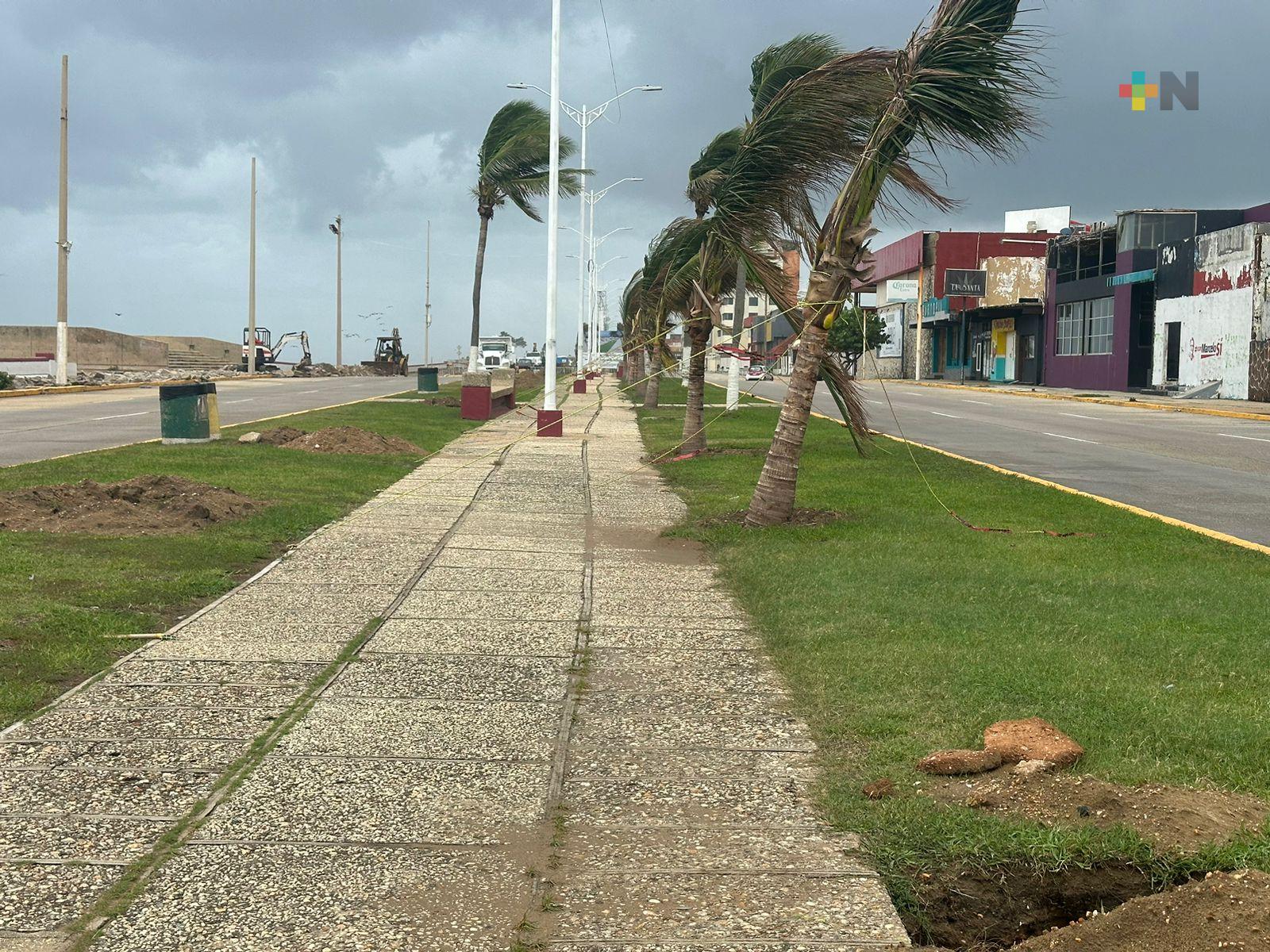 Aseguran palmeras de malecón de Coatzacoalcos por fuertes vientos