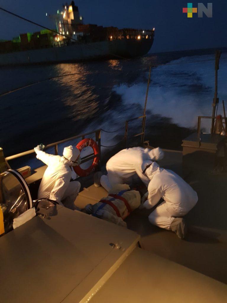 Veracruz, Ver.- Este jueves personal de la Primera Región Naval de Veracruz realizó la evacuación de un hombre de 27 años que viajaba a bordo de un buque mercante y presentó síntomas de COVID-19.