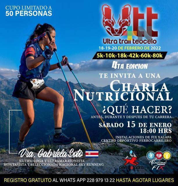 Como alimentarse antes, durante y después de una carrera de campo traviesa, será el motivo de la plática que ofrecerá la nutriológa, montañista y seleccionada nacional de sky running, evento convocado por la agrupación Perro Que Ladra organizadores de la cuarta edición del Ultra Trail de Teocelo del próximo 18, 19 y 20 de febrero.