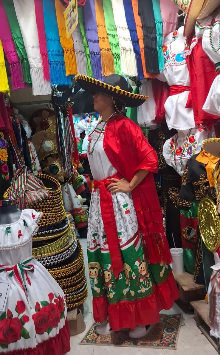 “Tenemos todos los vestidos mexicanos, blusas tricolores, faldas, sombreros. Para los pequeños, trajes para disfrazarse de Miguel Hidalgo y todos los personajes de la Independencia. Los pedimos y hay cosas que también se elaboran. Tenemos del Estado de México, Michoacán, Puebla. Hay trenzas, rebozos, blusas alusivas”.