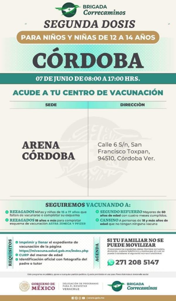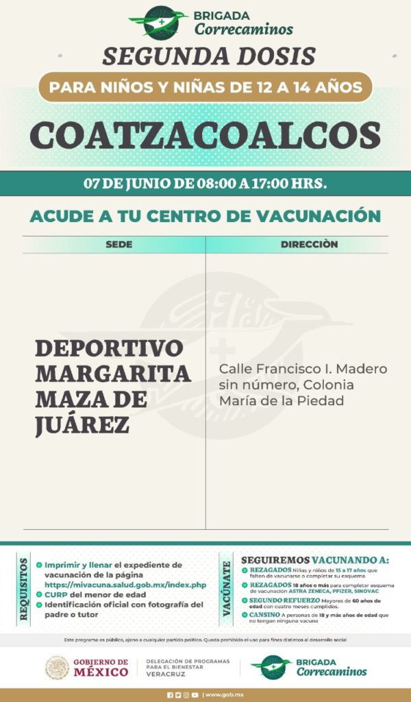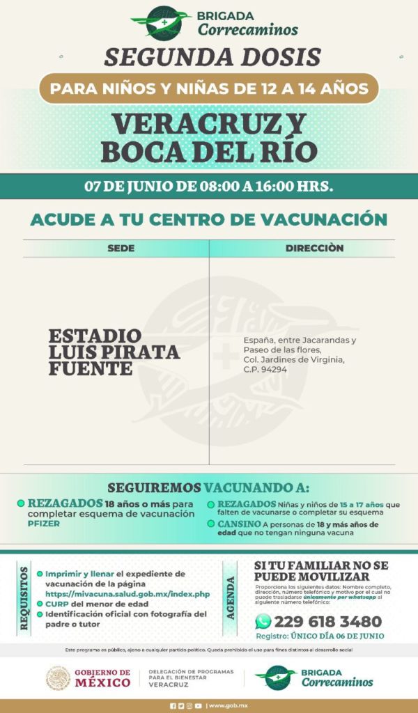 Debido a la gran afluencia en los operativos de vacunación, el Delegado de Programas para el Desarrollo, Manuel Huerta Ladrón de Guevara anunció que, en Córdoba, Veracruz-Boca del Río y Coatzacoalcos aumentará un día la aplicación de segunda dosis para los menores de 12 a 14 años.