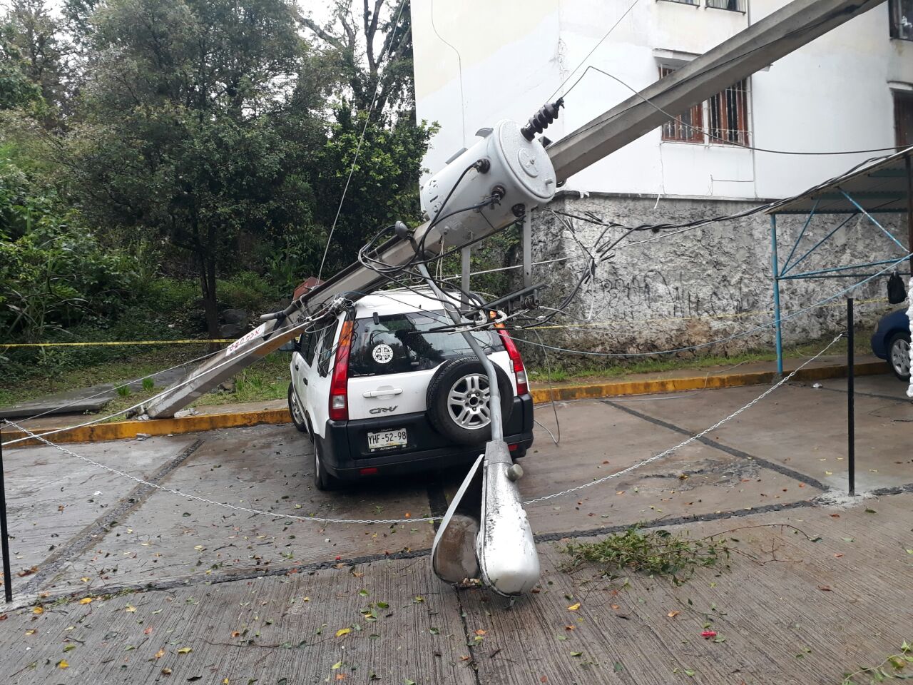 Xalapa, Ver.- Un árbol cayó, en el Andador Parque, de la colonia Agua Santa II, causando daños a cuatro vehículos que se encontraban estacionados, así como un corte en el suministro de la energía eléctrica, pues también derribó postes de la Comisión Federal de Electricidad.