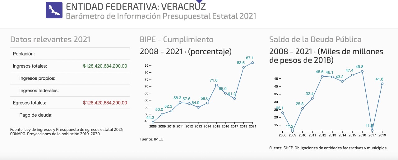 Xalapa, Ver.- En la publicación de este 29 de marzo, Veracruz obtuvo una calificación al alza en el reporte del Barómetro de Información Presupuestal Estatal (BIPE) realizado por el Instituto Mexicano para la Competitividad (IMCO).