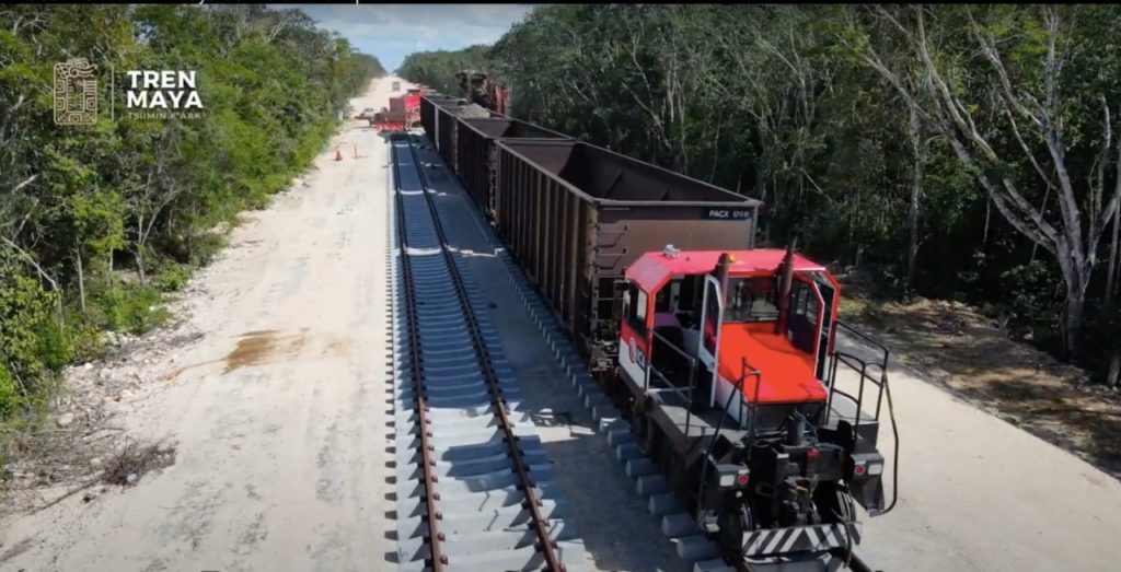 De igual forma, avanza la colocación de durmientes, así como la instalación de postes para la catenaria que permitirá la transmisión de energía eléctrica a las máquinas rodantes del Tren Maya.